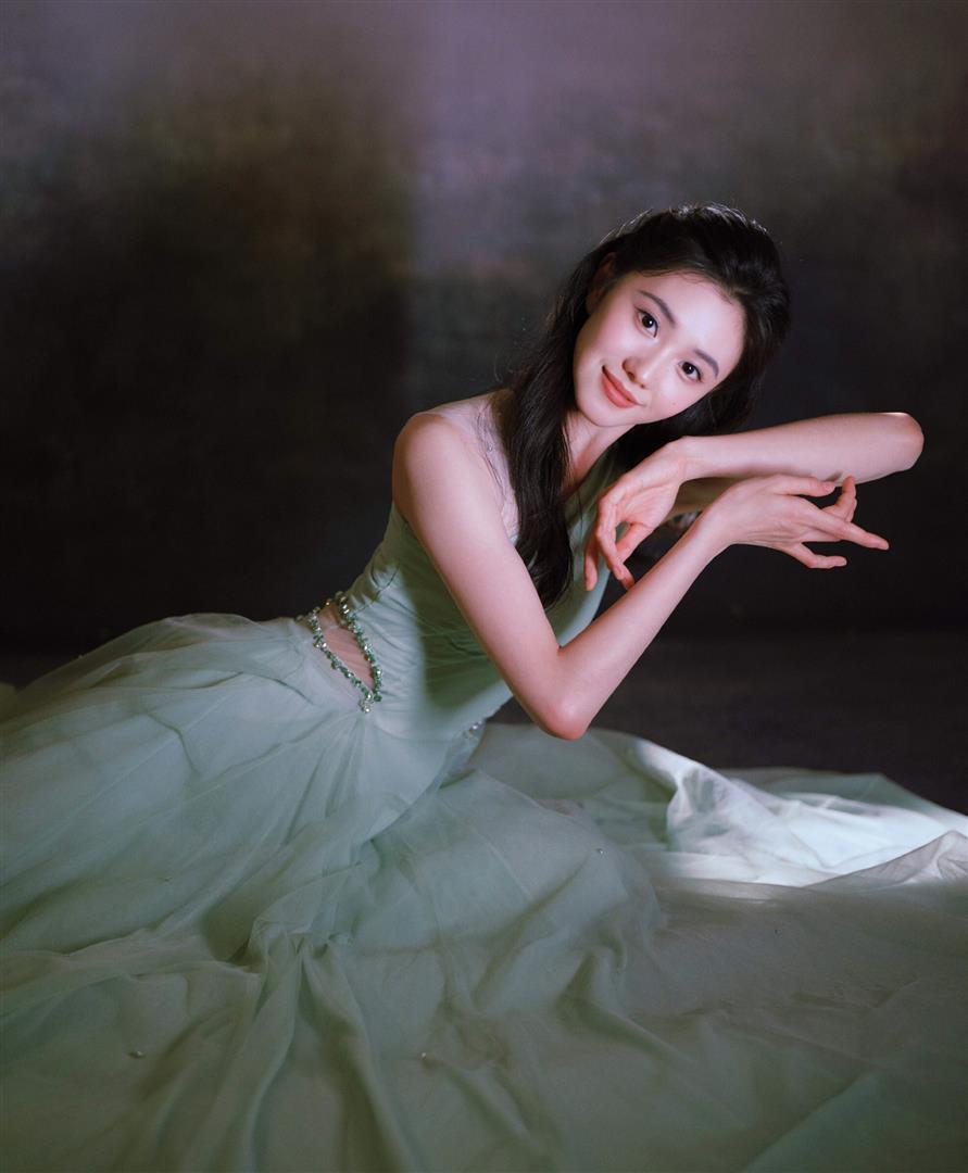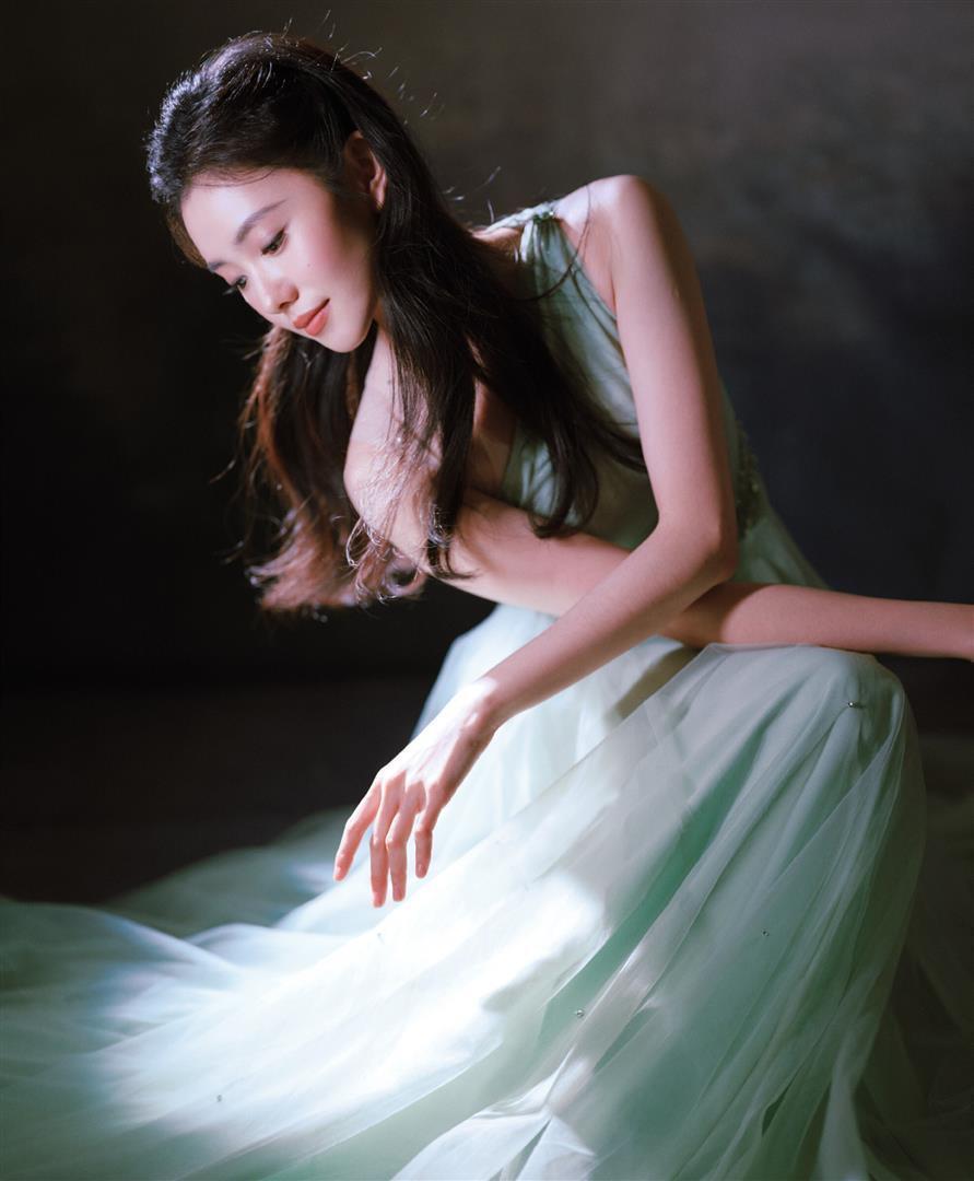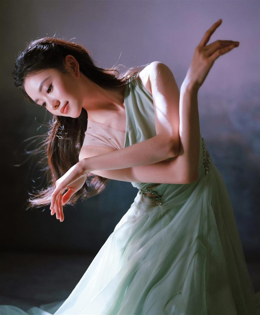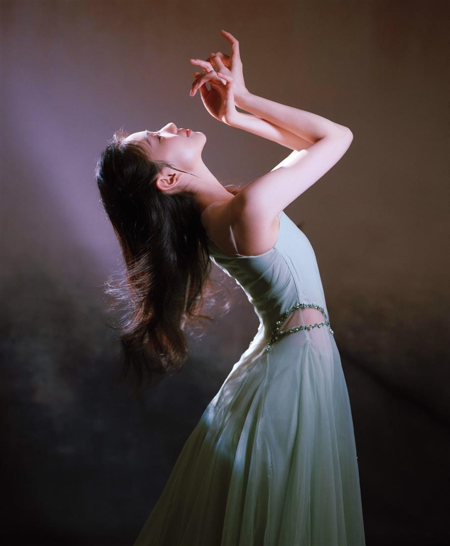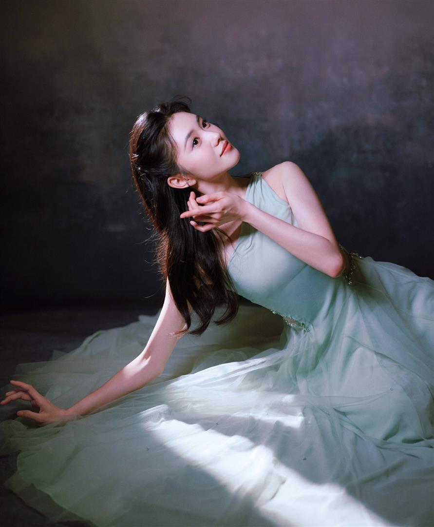 但真正的重头戏在晚上的表演环节。她换上了一身薄荷绿渐变纱裙再次登台。这套裙子腰侧有镂空设计,缀着细碎的钻,薄纱制成的裙摆层层叠叠。当她开始旋转时,裙摆飞扬起来,像一汪流动的春水。