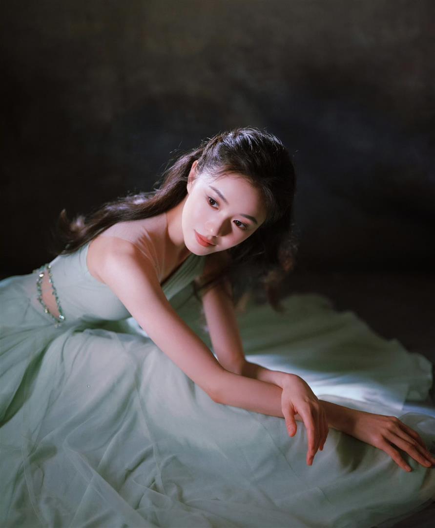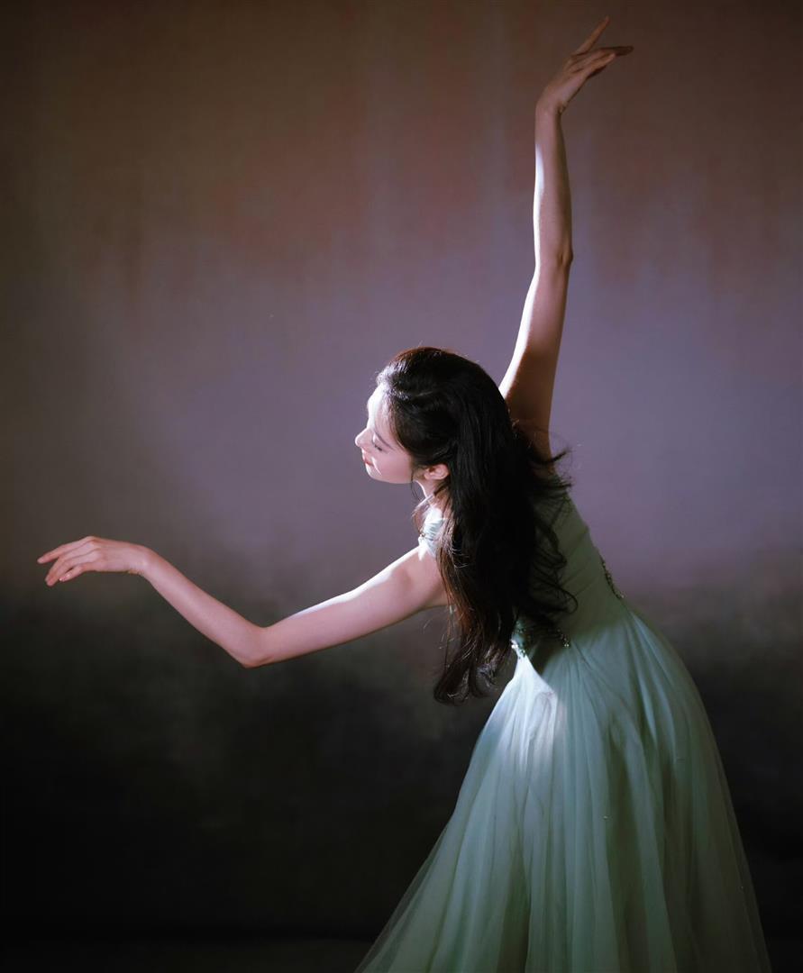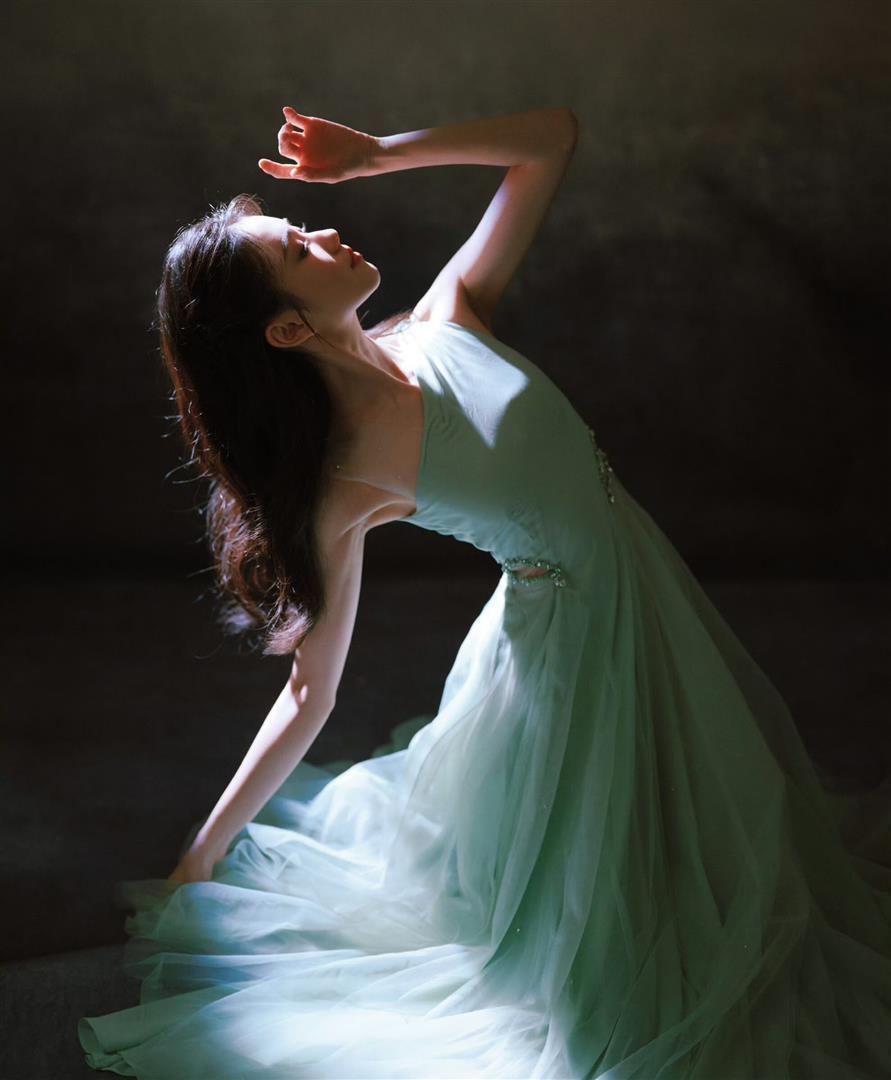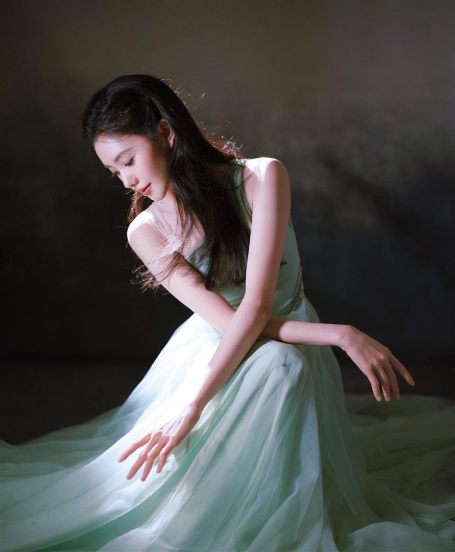 但真正的重头戏在晚上的表演环节。她换上了一身薄荷绿渐变纱裙再次登台。这套裙子腰侧有镂空设计,缀着细碎的钻,薄纱制成的裙摆层层叠叠。当她开始旋转时,裙摆飞扬起来,像一汪流动的春水。