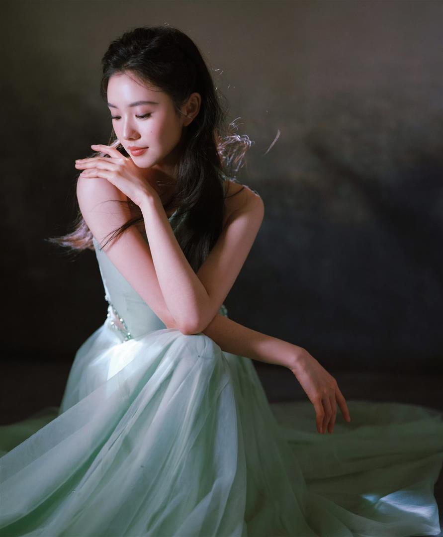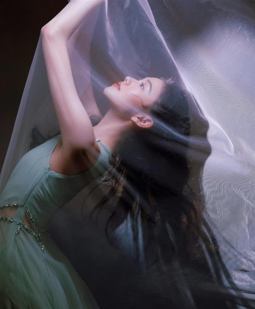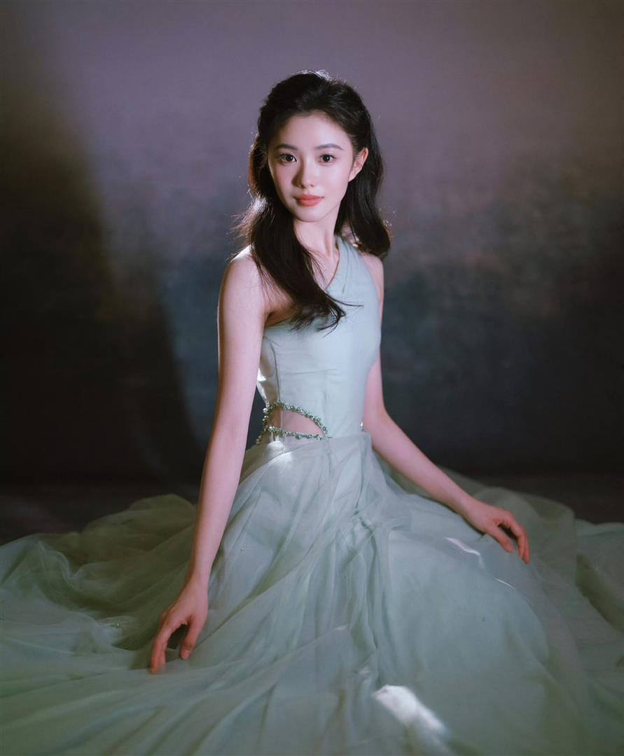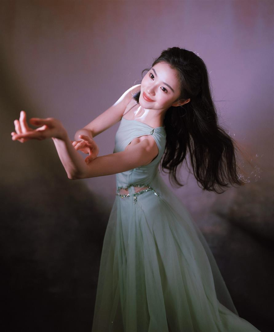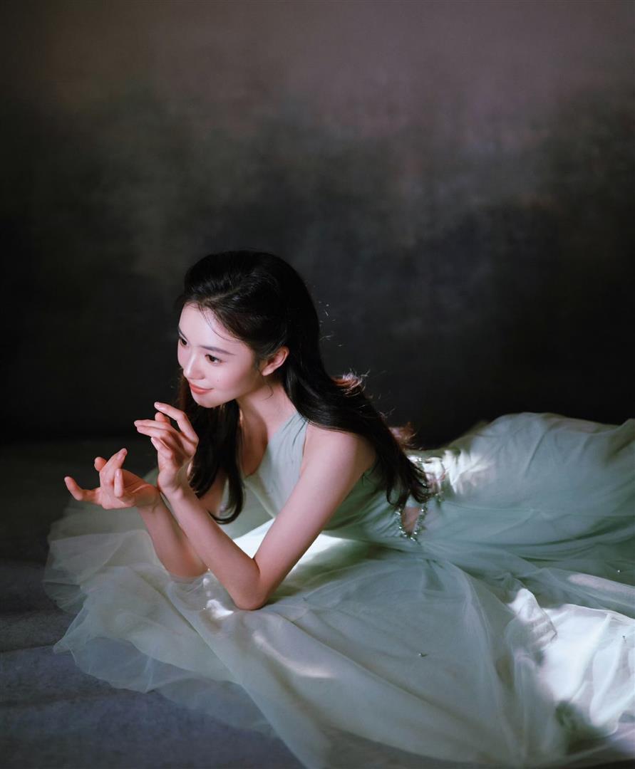 但真正的重头戏在晚上的表演环节。她换上了一身薄荷绿渐变纱裙再次登台。这套裙子腰侧有镂空设计,缀着细碎的钻,薄纱制成的裙摆层层叠叠。当她开始旋转时,裙摆飞扬起来,像一汪流动的春水。