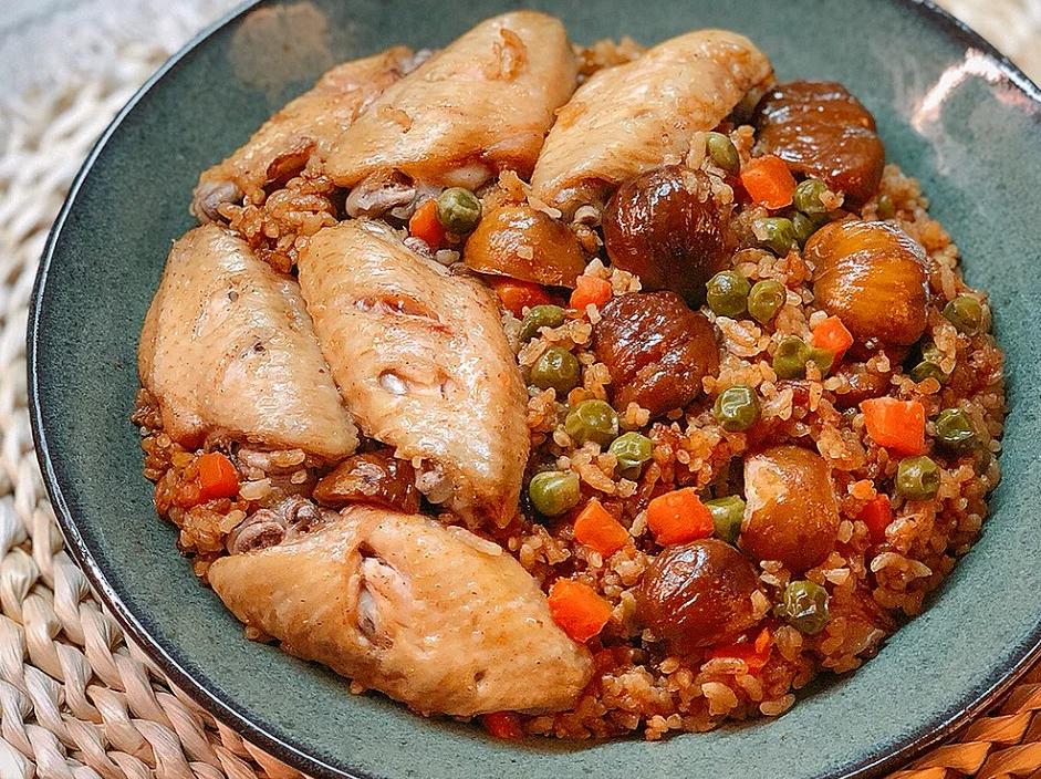 食材: 6 个鸡翅、15 个板栗、半根胡萝卜、50 克青豆、姜丝、大米 250 克、生抽4 勺、老抽 1 勺、料酒 2 勺、蚝油 2 勺、胡椒粉半小勺、食用油 1 勺、白糖 1 小勺、盐适量