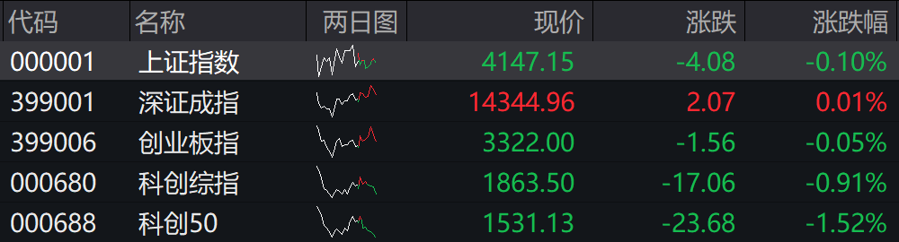 截至午盘,沪指跌0.1%,深成指涨0.01%,创业板指跌0.05%。科创综指跌0.91%,科创50指数跌超1%。