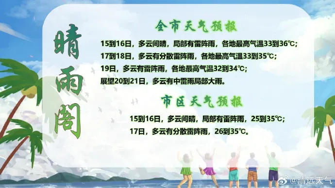 清远市气象台预计,未来一周前期,清远依旧高温炎热,后期雷雨有所增多,大家注意防暑防晒。详细天气如下↓